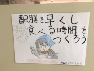 保健給食委員会では、給食準備を早くして食べる時間を確保する為タイムトライアル週間を実施したり、ハンカチチェックや食べ残しゼロを目指す強化週間を設定したりしています。今年度はまだ実施できていませんが、色々な事を?生徒のみなさんに投げかけています。担任の先生も少しでも好き嫌いをなくすために、一口でも食べてもらうように働きかけています。