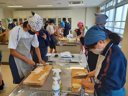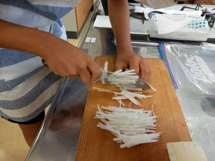 初めての調理室で慣れない中、どの生徒も包丁を安全に正しく使って丁寧に大根を切っていました。動画を撮っている人も思わず「気をつけて!」「ゆっくりね!」と声が出てしまうほどみんな真剣です。