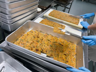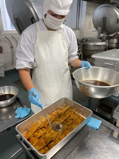続々と焼き上がり、生地を切ってタレをかけています。(高橋)