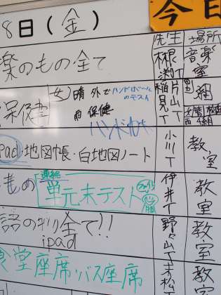 今日は比較的涼しい朝で青空も見えています。教室後ろのホワイトボードには様々な情報が。。必要な情報もあり‘切実な願い’もあり。