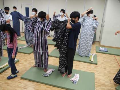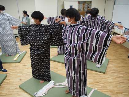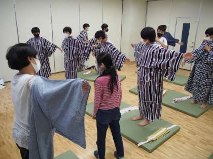 13期生対象の着付け教室の最終日です。地域の方に浴衣の身に着け方を教えてもらいました。これを着て夕方から盆踊りに行ける日が待ち遠しいですね。
