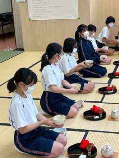 3回のお稽古でしたが、充実した時間になりました。3年生が点てたお茶がきれいに泡立ち、美味しそうです。お稽古の後、浴衣の着付けが2回できなかった生徒が残って着付けの練習をしました。みんなで浴衣を着たのも楽しかったですね。お家でも練習してみてください。夏休みも残すところあと少し。二学期に向けて、準備をしてくださいね。(大橋)