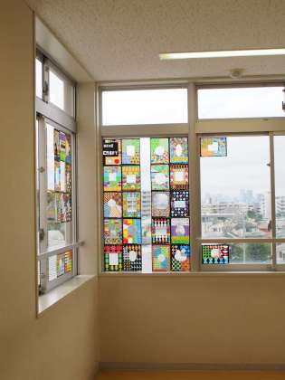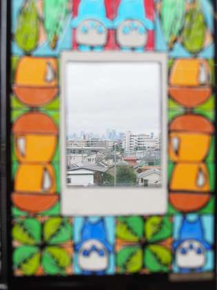 12期生の廊下窓ガラスに貼られている美術の作品のお蔭で、いつもとは違う雰囲気のフナキボ。今日はこのうちの作品の小窓から新宿の都心を写してみました!