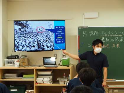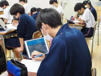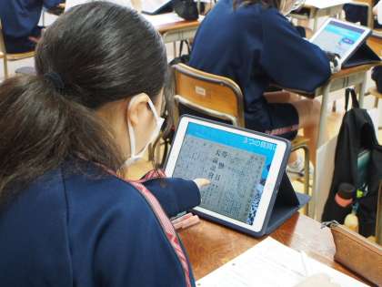 社会科の歴史で研究授業をしています。11期生の日頃の授業の様子がそのままわかる研究授業でした。タブレットで資料を拡大しながらワークシートに解答を書いています。