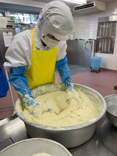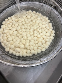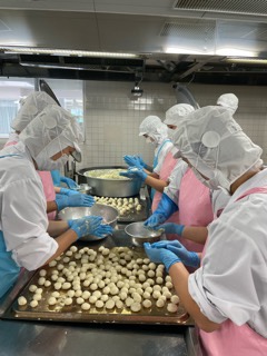 今日は、お月見団子汁に入る白玉団子を手作りしています。白玉粉に脱脂粉乳を入れて、カルシウム強化!丸めた団子を茹でてから水にさらし、汁に入れて煮込みます。(高橋)