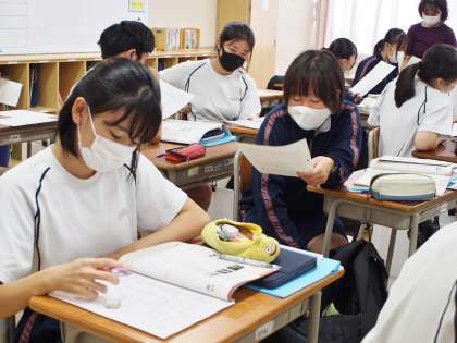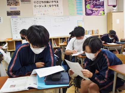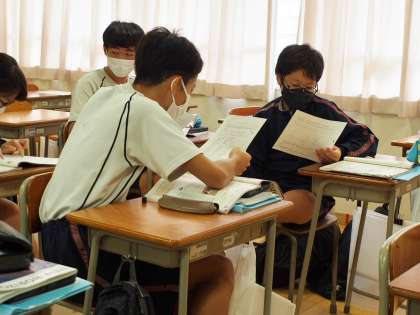 こちらも英語の時間に何度もみられた場面です。英語の時間も、先生の説明のあと間髪入れずにペアワークに移るフナキボ生。これも1年生からの積み重ねが活きています。