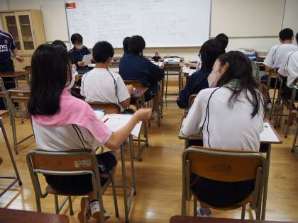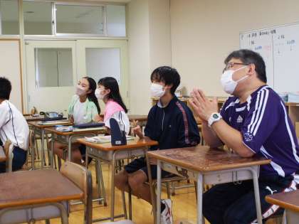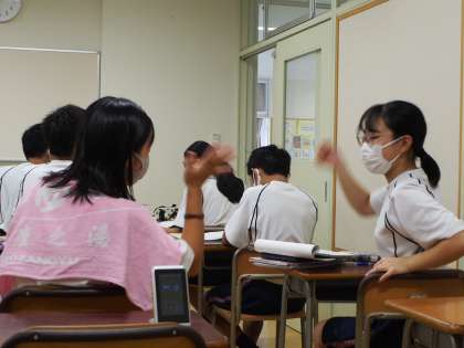 水泳の授業のすぐ後なので、髪の毛を乾かしながらの英会話を元気にやっています。ペアが隣にいない席には、先生が入っています。先生も楽しそうですね。