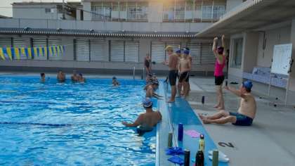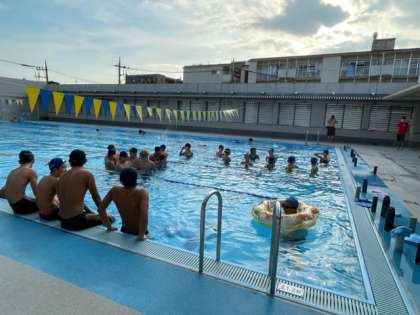 昨日の放課後、水泳部で行われた三送会に3年の先生方も参戦し、チーム対抗リレーをしました。もちろん先生方には部員より50m短いハンデをもらい、いざ勝負!
