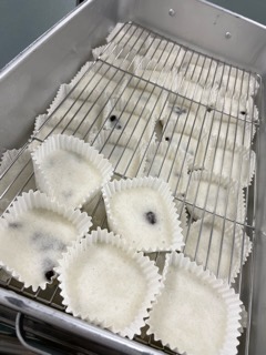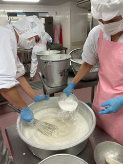 今日の給食は鶏飯です!デザートに軽羹を作りました。生地には、卵白や長芋、上新粉などが入ります。中には甘納豆を入れました。初めて食べる人も多いと思いますが、まずはひと口味わってもらえたら嬉しいです。(高橋)