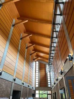 富士山科学研究所は山梨県の施設だけに、木をふんだんに使い立派な建物です。吹き抜けの天井を見上げて思わず写真を撮っていたところ、稲見先生から残念なお知らせがみんなに告げられました。「オリエンテーリングの施設から連絡があり、コースの状況がかなり良くないので本日は中止とさせてください、とのことです。なので今からすぐ学園に向かいます」
