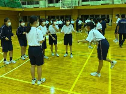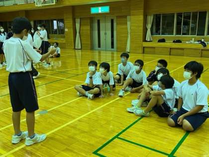 体育館中央にある袋から、お題が書いてある紙を取り、自分のグループにジェスチャーでお題を当ててもらう、というゲーム!笑わずにみているのは難しいなあ。