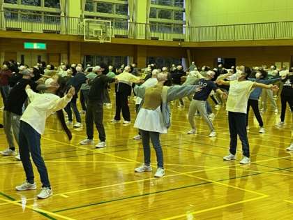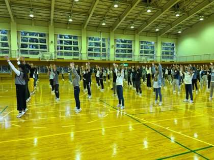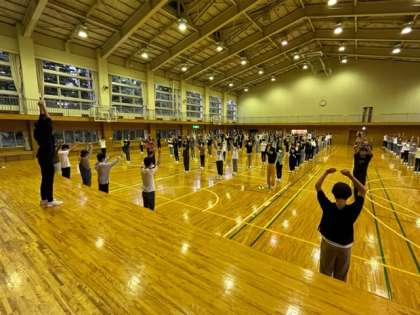 体育館でラジオ体操です。まだ眠い人、目が覚めるかな??。