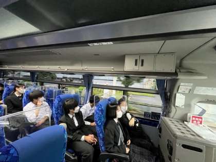 出発しようとしたら一台のバスのエンジンがかからず…。急遽、他のバスに1班ずつ分散して出発しました。このバスでは他クラスのメンバーをお迎えするにあたりあたたかい拍手が起こりました!
