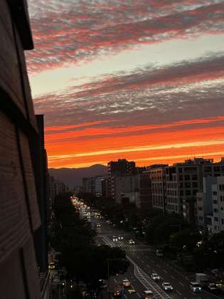 宿泊中のホテルから見えた夕焼けです。今日歩き回ったら11期生、みてるかな?