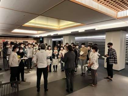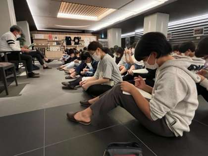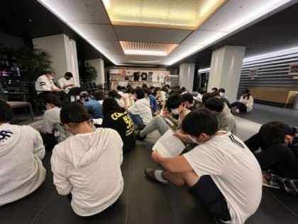 興奮冷めやらぬレク大会が終わってほんの10分後にロビーに集まった班長室長のメンバー。真剣に今後の予定、明日のタクシー行動の注意事項をメモしています。この切り替えの凄さは歴代フナキボ3年生でも三本指に入るのでは、と思わせほどです。