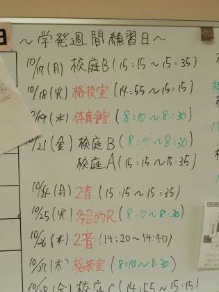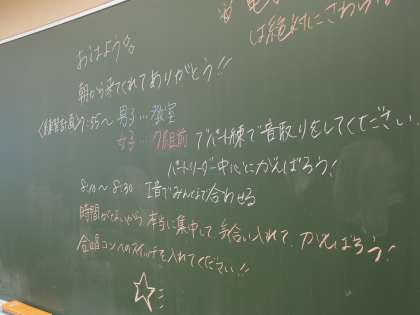 今日から合唱の朝練習が始まります。ホワイトボードに書かれた予定表見ると結構タイトなスケジュール。時間を有効に使うことが必要のようです。それにしても「来てくれてありがとう」気持ちがつたわるといいですね。