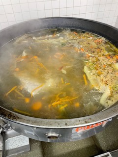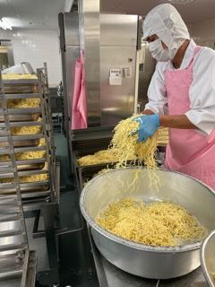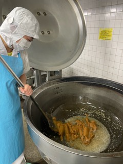 今日の給食はみそラーメンです!ふなきぼでは、味噌を最初に炒めてから作っています。すでに良い香りがしています。麺はほぐし、鶏ガラスープも取れました。これからみそに肉と野菜を入れ、スープを作っていきます。寒くなってきたので、身体の中から温まりますね。おかずにはしゅうまいと中華サラダがつきますよ〜!(高橋)