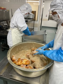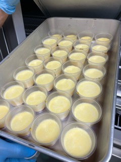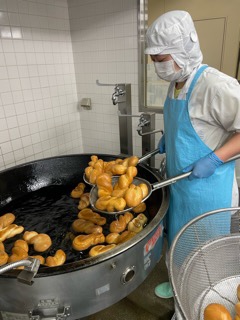 みなさんの大好きな組み合わせで、学芸発表会を応援しています!!揚げパンは、絶妙な揚げ加減を逃さないよう、二刀流で揚げています!!プリンはカラメルも生地部分も手作りしています。(高橋)