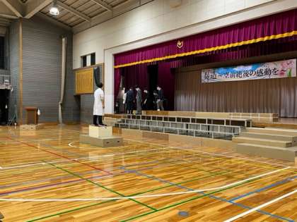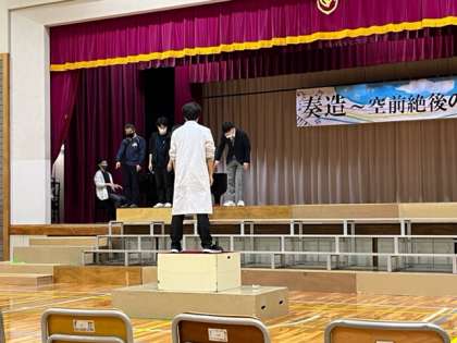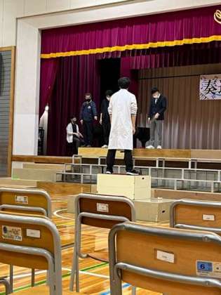 午後7時、明日の学芸発表会に向けて、先生たちも最後の仕上げです。舞台と指揮者、伴奏者との位置関係を調整していました。何度も確かめています。