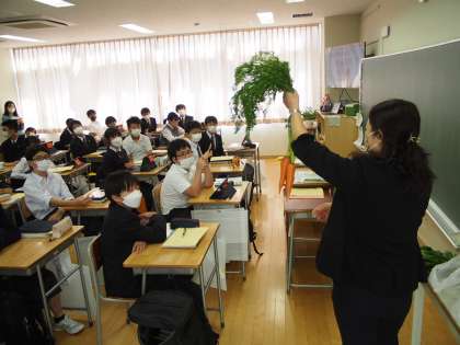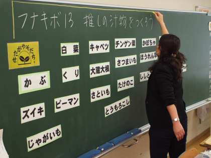 午後は世田谷区の家庭科の先生方の研究会がフナキボで行われました。1年7組が取り組むのは「13期生 いち推しの汁物」をつくること。世田谷育ちの野菜などを使い、汁物のレシピを考えます。