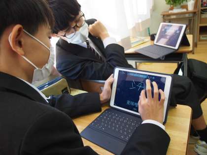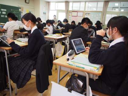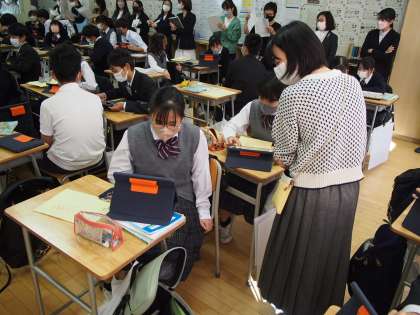 中にはグループで机を囲まないところもあります。「今日は机をピッタリ付けなくてもいいですよ」と先生からアドバイスがありました。とういのも、ロイロノートの共有ノートの機能を使い、リアルタイムで友人が書いた画面を3〜4人のグループで見ることができるからです。コロナ禍の新たな話合いの手法かもしれませんね。今日は栄養士さんも授業を見に来ました。