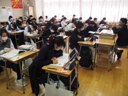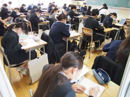 今日で期末考査は終了です。試験前最後の確認をしているところにカメラをもって行くと、どのクラスも真剣そのもの。最後列の生徒は、社会科のテストに向け、ノートに社会科の用語を漢字で必死に書いていました。