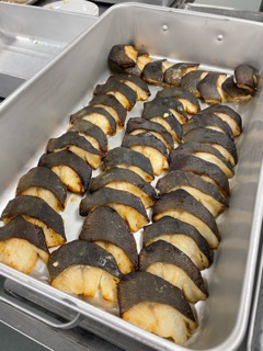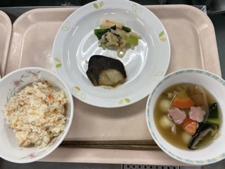 明けましておめでとうございます。今日から給食が始まります。メニューはお正月と鏡開きに因んで、白玉雑煮です。西京焼きは銀だらを使っています。雑煮は、梅型かまぼこなどで彩りました。残さず食べて、元気に過ごしてほしいです。給食室一同、今年もよろしくお願いいたします。(高橋)