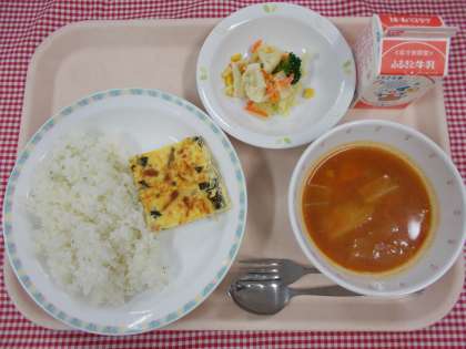 1年生が家庭科の授業で作成した汁ものが、給食に登場します。今日は1年1組のレシピ「ハピネストローネ〜幸せを添えて〜」です。みんなに幸せを届けたい!という想いから生まれたレシピだそうです。各クラス1品ずつ、3学期の間に登場しますので、お楽しみに♪