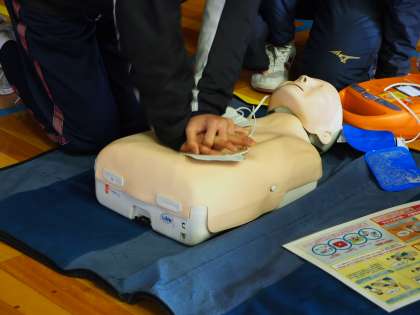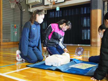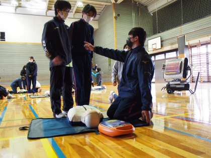 12期生が心肺蘇生法とAEDの扱いについて学んでいます。指さし確認や胸骨圧迫のポイントを動画で見たあと、ダミー人形を使って実地に学びます。人形にはセンサーが内臓されていて先生のPC画面に情報が行く仕組み。「2番の班、もう少し早く」と指示がでます。