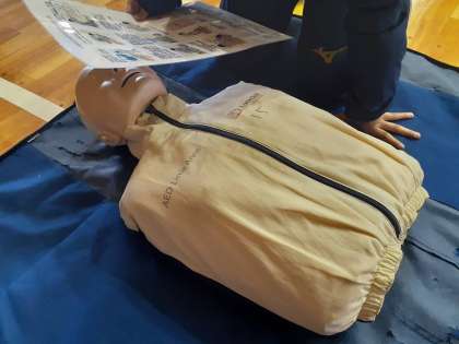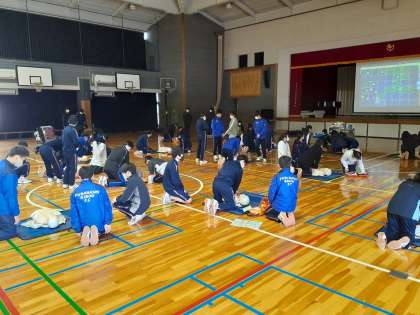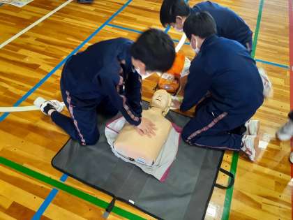 マネキン(アンちゃん)を用いて、心肺蘇生法の実習を行いました。