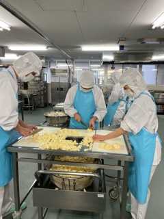 外の体育も寒そうですが、給食室も朝から寒い中頑張っています!温度計を見たら、室温は10℃(昨日は8℃)でした。そんな中、冷たい水で食材を洗い、カットしてくださっています。調理員さん、今日もありがとうございます。(高橋)