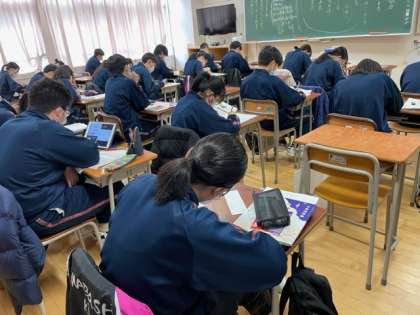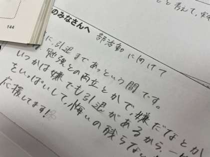 今日のローテーション道徳は四組で行いました。誇れる集団でいるためにというテーマで、最後に後輩へのメッセージを記入しました。