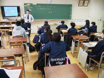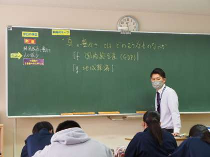 公民的分野では「経済の持続可能性と真の豊かさ」について報道番組や画像の資料をもとに学んでいます。最後にこれからの社会に必要な豊かさについて自分の考えをまとめていました。