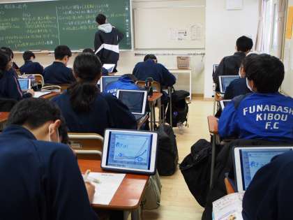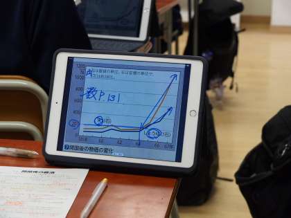 歴史の授業では江戸末期の開国後の経済について学んでいます。ICTはもちろん使っていますが、ワークシートなど手書きのものと併用するハイブッド形式です。教室の前にある50インチモニターと同じ画面が手元のタブレットにも映るので、画像の見やすさと、プリント記入の際の視線の移動が少なくてすむ、というメリットがあります。