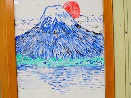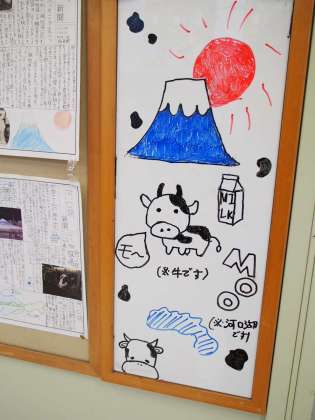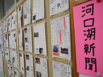 13期生の教室前に貼られている河口湖新聞。各クラスの入口にタイトルが書かれていますが、その下のスペースに書かれている河口湖の‘絵画’がこれまたいいのです。力作あり、ほのぼのあり。ぜひご覧ください。