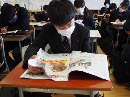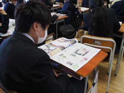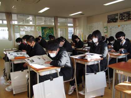 土曜授業の朝は「NIEタイム」から始まります。今日の中高生新聞のトップ記事は部活の地域移行の話題です。「卒業式のマスク」についてのニュースも載っています。
