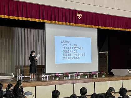対面式では、先輩がフナキボでの生活や委員会活動についてプロジェクターを利用して説明しています。