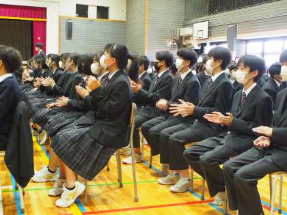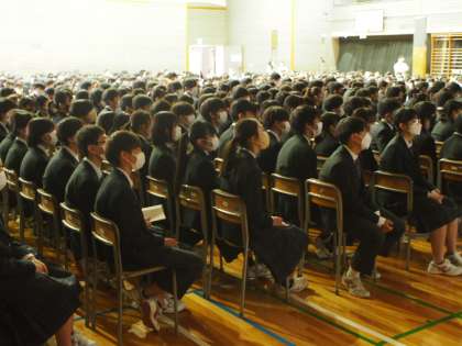 「フナキボ生ならでは」というものが本校にはいくつもあります。そのうちのひとつが「真剣なまなざし」です。対面式が行われる体育館にカメラをもって入ると、まず気がつくのは上級生の真剣な表情です。1年生入場の時も、代表生徒のメッセージの最中も、スクリーンを見ている時も、いつも真剣なまなざしの顔をみることができます。