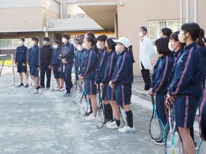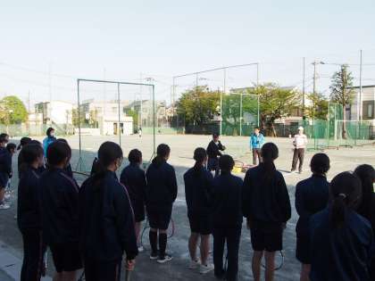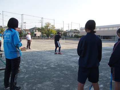 放課後は、ソフトテニス部に何やら年配のコーチがいます。世田谷区スポーツ振興財団から‘強力な助っ人’である外部指導員の方が来てくださいました。眼差しが真剣です。