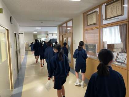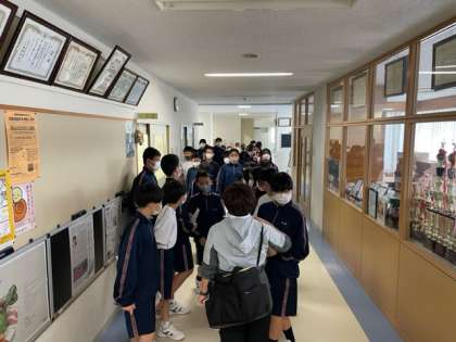 一年生の3,4時間目には校内巡りを行いました。職員室の入り方を知ったら、ギャラリーのトロフィーの数に驚いたり、新鮮な時間だったと思います。