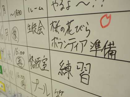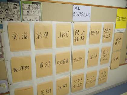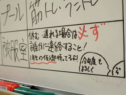 部活の仮入部が始まる時期となりました。入部用紙を入れる封筒があるのは部活動黒板の横です。その部活黒板にも新入生へのメッセージが書かれています。【菅野】