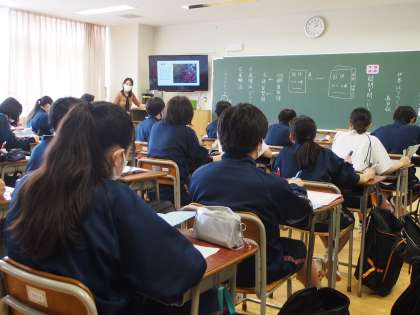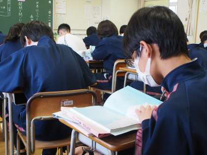 3年生の国語の授業です。教科書の裏表紙にある詩を読み、問題から答を導くのではなく『問い』を考える授業です。「どうせ考えるならA評価がもらえる問いを考えよう」ということで「なぜ○○なのか?」という形式の問題をひたむきに,真剣に考える12期生です。【菅野】