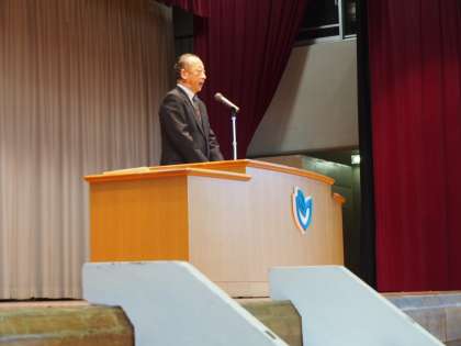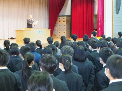 「おはようございます。4月になってから2週間がたちました。ここにいる全員が、それぞれフナキボ生としてどんな1年間にするか、年度の始めである今月は決意を新たにしていると思います。