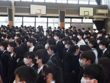 でも、小学校高学年から中学校2年生までの最も多感な時期に行動制限にあったここにいるみなさんは、人と出会い、話をし、交流することの価値を誰よりもよく知っているはずです。新しいクラス、新しい友だち、新しい先生、そして1年生にとっては初めての中学校。人は、今までの自分とは異なるものをもつ人と接する時にこそ大きな成長をとげることができるものです。ぜひこの3年間ためてきたエネルギーを、フナキボでできるだけ多くの同級生、先輩との交流に注いでほしいと思います。以上で話を終わります。」
