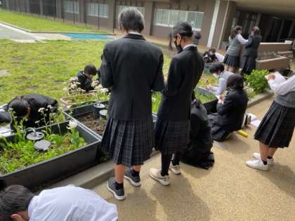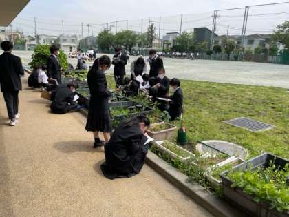 職員室の外から楽しそうな声が聞こえたので外を覗くと1-3が生き物や植物の観察をしていました