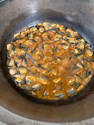 さばの味噌煮は、大きな釜2つで朝8時からぐつぐつ煮ています。