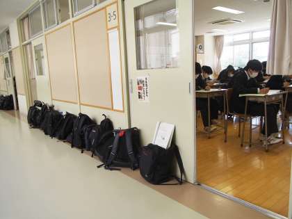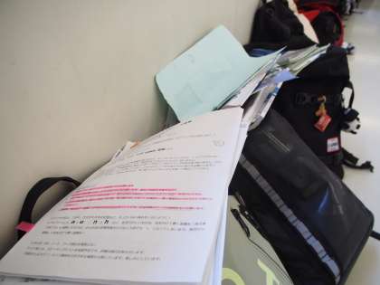 12期生が廊下に並べてある荷物を見ると、おそらく直前まで必死に勉強したであろう努力のあとが垣間見得ます。ガンバレ〜!【菅野】