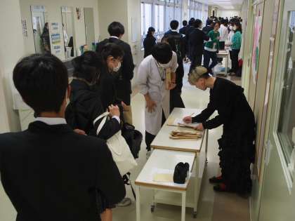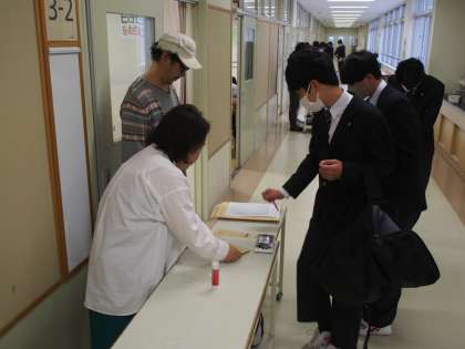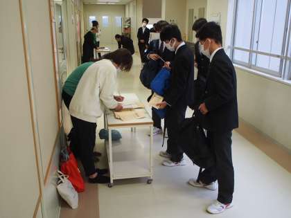 昨日はPTA会費の納入日。持参した会費を教室に入る前に手渡しで渡しています。「おねがいします」を言って渡している生徒が多いこともフナキボならではです。【菅野】