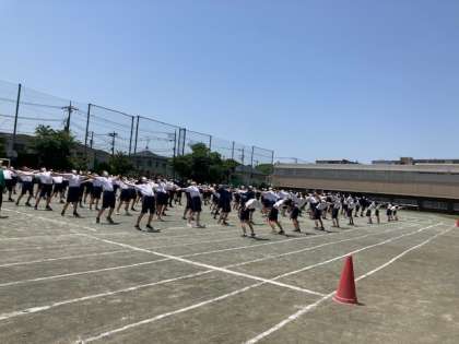 まずはラジオ体操です。点数に入らない種目も全力で頑張ります。クラスリレーでは各クラスとも大きな声で応援する声が響いていました。気合いにあふれています。(前田)