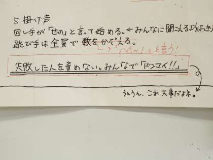 12期生の教室には、卒業した先輩からの大縄攻略レシピがありました。そしてただ回数をめざすだけでなく「仲間を思う気持ちが大事」と伝えているところがさすがフナキボの先輩です。【菅野】